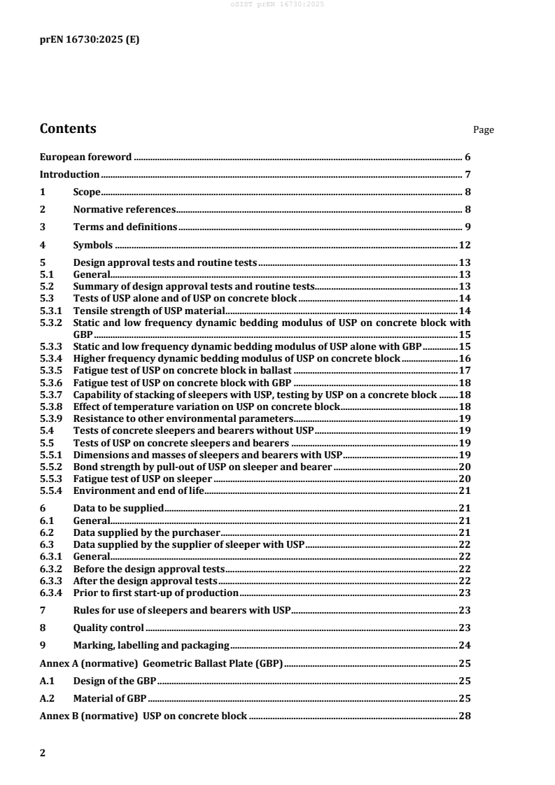 Keywords: oSIST prEN 16730:2025, concrete sleepers, under sleeper pads, railway track standards, ballast track, fatigue testing, bond strength test, railway infrastructure, quality assurance, CEN standards, track components, vibration damping, environmental durability.
