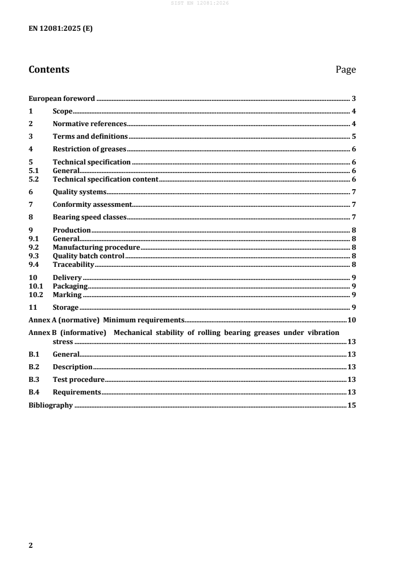 SIST EN 12081:2026 is a standard published by the Slovenian Institute for Standardization (SIST). Its full title is "Railway applications - Axleboxes - Lubricating greases". This standard covers: This document is a part of a package of standards: EN 12080, EN 12081, EN 12082-1 and EN 12082-2. This document specifies the quality requirements of greases intended for the lubrication of axlebox rolling bearings according to EN 12080, required for reliable operation of trains on European networks. It covers the requirements for conformity assessment of new greases, as well as requirements for quality batch control and change management.