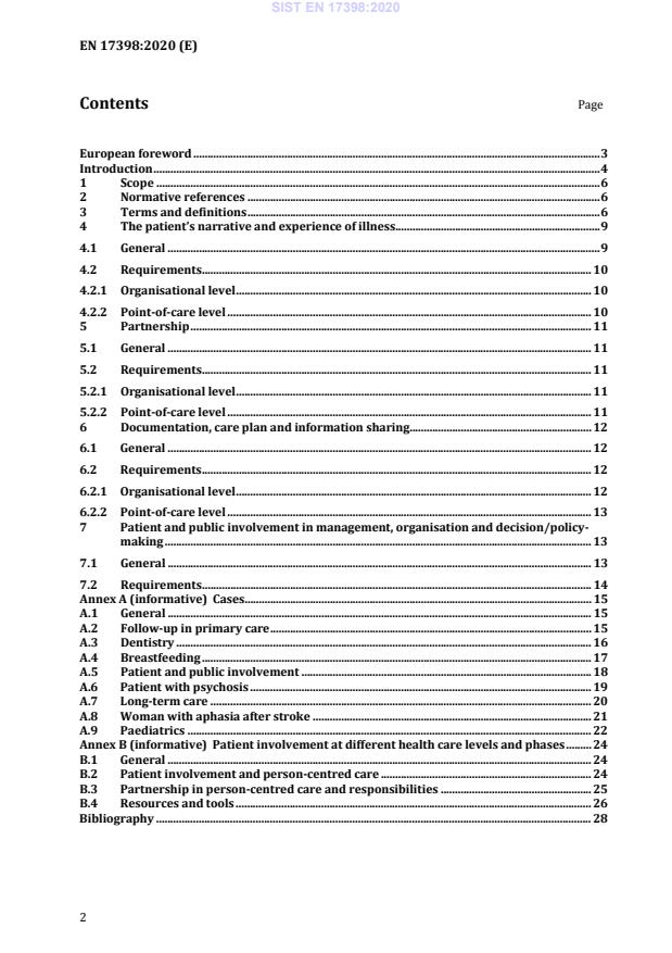 SIST EN 17398:2020 is a standard published by the Slovenian Institute for Standardization (SIST). Its full title is "Patient involvement in health care - Minimum requirements for person-centred care". This standard covers: This document specifies minimum requirements for patient involvement in health care services with the aim to create favourable structural conditions for person-centred care. It is applicable for use before, during and after the actual care that is provided by the care personnel. This document is also applicable for use on a strategic level for quality assurance and quality improvement, for procurement, educational and supervisory purposes and as a guiding document for research and development projects in the field of intervention and implementation of person-centred care.