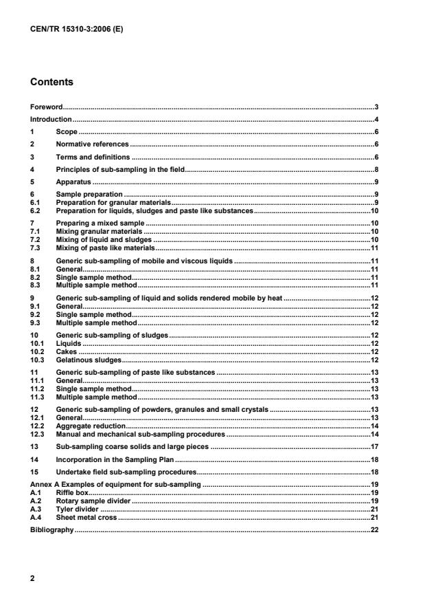 Keywords: CEN/TR 15310-3:2006, sampling of waste materials, sub-sampling in the field, waste characterization, sampling plan, field sub-sampling procedures, sample preparation, riffle box, rotary sample divider.