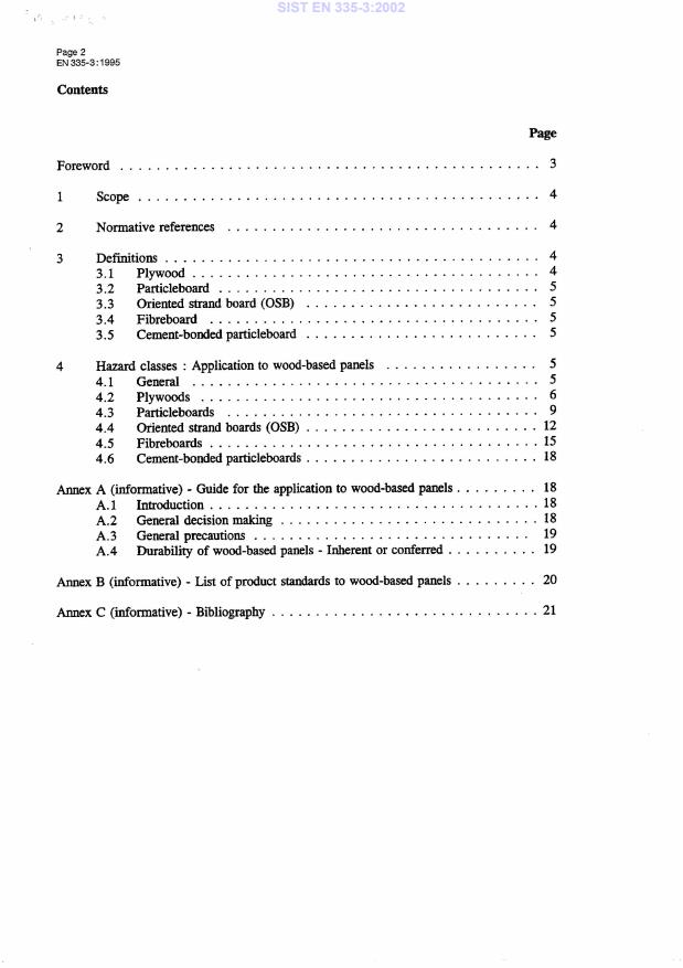 SIST EN 335-3:2002 is a standard published by the Slovenian Institute for Standardization (SIST). Its full title is "Durability of wood and wood-based products - Definition of hazard classes of biological attack - Part 3: Application to wood-based panels". This standard covers: This Part of EN 335 gives guidance on the application of the hazard class system, as defined in Part 1 of EN 335, to wood-based panels: plywood, particleboards, oriented strand boards, fibreboards, cement-bonded particleboards in relation only to the biological agencies that can attack wood-based panels over a duration sufficient to result in deterioration. This Part is to be used in conjunction with Part 1 of EN 335. Annex A (informative) provides additional guidance on the use and suitability of wood-based panels, preservative treatment and/or finishing within a given hazard class.