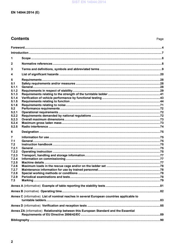 Foreword . 4 Introduction . 7 1 Scope . 8 2 Normative references . 8 3 Terms and definitions, symbols and abbreviated terms . 9 4 List of significant hazards . 20 5 Requirements . 28 5.1 Safety requirements and/or measures . 28 5.1.1 General . 28 5.1.2 Requirements in respect of stability . 29 5.1.3 Requirements relating to the strength of the turntable ladder . 41 5.1.4 Verification of vehicle performance by functional testing . 43 5.1.5 Requirements relating to function . 44 5.1.6 Requirements relating to noise . 71 5.2 Performance requirements . 72 5.2.1 Operational requirements . 72 5.2.2 Requirements demanded by national regulations . 72 5.2.3 Overall maximum dimensions . 73 5.2.4 Maximum gross laden mass . 73 5.2.5 Radio interference . 74 6 Designation . 75 7 Information for use . 75 7.1 General . 75 7.2 Instruction handbook . 75 7.2.1 General . 75 7.2.2 Operating instruction . 75 7.2.3 Transport, handling and storage information . 77 7.2.4 Information on commissioning . 77 7.2.5 Machine details . 77 7.2.6 Maximum loads in the rescue cage and/or on the ladder set . 78 7.2.7 Maintenance information for use by trained personnel . 78 7.2.8 Special working methods or conditions . 78 7.2.9 Periodical examinations and tests . 78 7.3 Marking . 79 Annex A (informative)