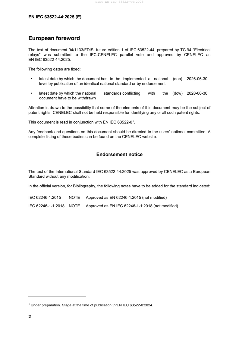 EN IEC 63522-44:2025 - published by CLC/CENELEC and identical to IEC 63522-44:2025 - specifies a standardized salt‑mist (salt spray) test method for electrical relays. The standard is used to assess the ability of relays (electromechanical, reed, solid‑state, time relays and combinations) to withstand corrosive atmospheres encountered during transportation, storage and operational use. The test procedure refers to IEC 60068‑2‑11 (Test Ka) and IEC 60068‑2‑52 (Test Kb) and is intended to evaluate protective coatings, contact integrity and overall relay durability in salt‑laden environments.
