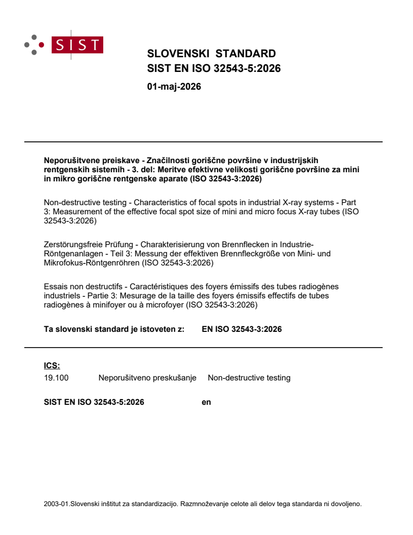 SIST EN ISO 32543-5:2026 is a standard published by the Slovenian Institute for Standardization (SIST). Its full title is "Non-destructive testing - Characteristics of focal spots in industrial X-ray systems - Part 3: Measurement of the effective focal spot size of mini and micro focus X-ray tubes (ISO 32543-3:2026)". This standard covers: This document specifies a method for the measurement of focal spot sizes within the range of 5 µm to 300 µm of X-ray systems up to and including 225 kV tube voltage. This determination is based on the evaluation of an image with a dedicated focal spot that has been radiographically recorded using an edge and evaluated with a digital method. The imaging quality and the resolution of X-ray images depend highly on the characteristics of the effective focal spot, in particular its size and the two-dimensional intensity distribution as seen from the detector plane. For the characterization of commercial X-ray tube types (i.e. for advertising or trade), the nominal values of Annex A are preferred. NOTE The same procedure can be used at higher kilovoltages by agreement but the accuracy of the measurement can be poorer.