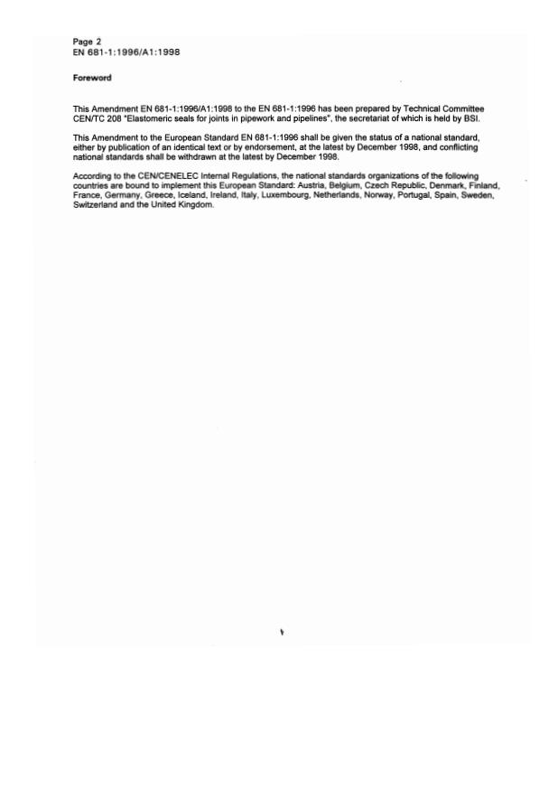 SIST EN 681-1:2000/A1:2000 is a amendment published by the Slovenian Institute for Standardization (SIST). Its full title is "Elastomeric seals - Material requirements for pipe joint seals used in water and drainage applications - Part 1: Vulcanized rubber". This standard covers: Migrated from Progress Sheet (TC Comment) (2000-07-10): Shortened UAP of 4 months (CC/970723)
