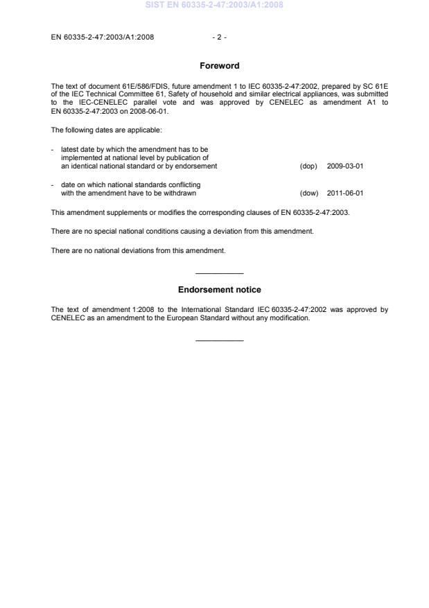 This amendment A1 modifies the European Standard EN 60335-2-47:2003; it was approved by CENELEC