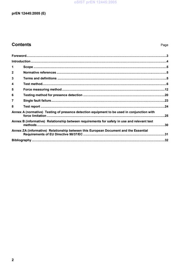 oSIST prEN 12445:2005 is a European standard developed by CEN that specifies test methods for evaluating the safety in use of power operated industrial, commercial, and garage doors, gates, and barriers. It focuses on demonstrating compliance with the safety requirements defined in prEN 12453:2005, particularly measuring the forces generated by power operated doors and related safety checks. This standard is essential for manufacturers, installers, and safety authorities to ensure the safe design, installation, and operation of automated door systems.
