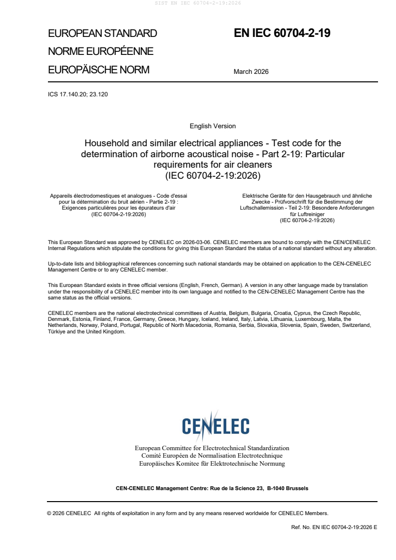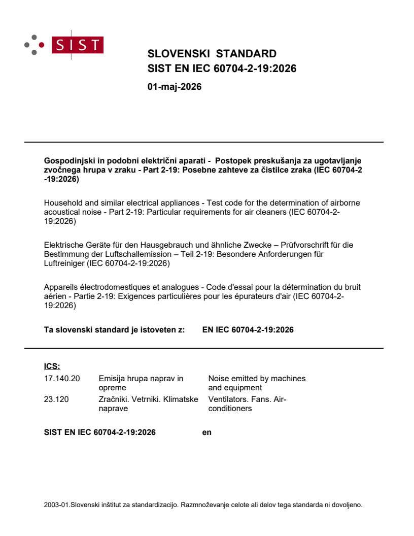 SIST EN IEC 60704-2-19:2026 is a standard published by the Slovenian Institute for Standardization (SIST). Its full title is "Household and similar electrical appliances - Test code for the determination of airborne acoustical noise - Part 2-19: Particular requirements for air cleaners (IEC 60704-2-19:2026)". This standard covers: IEC 60704-2-19:2026 applies to stationary freestanding and wall-mounted air cleaners for domestic and similar use, supplied from mains, d.c. voltage not exceeding 48 V or batteries. This document includes combination products, where air cleaning is combined with for example humidification, but can be used only for the air cleaning function. This Part 2-19 is intended to be used in conjunction with IEC 60704-1:2021, Household and similar electrical appliances - Test code for the determination of airborne acoustical noise - Part 1: General requirements.