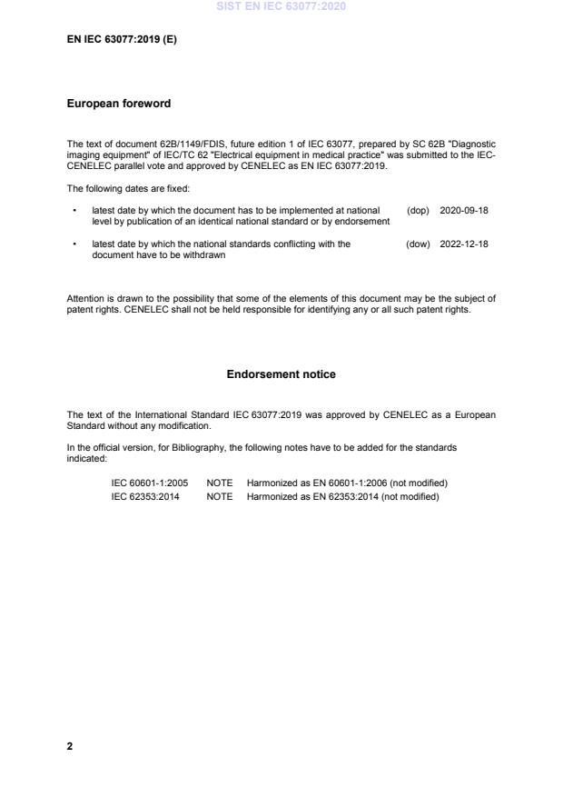 SIST EN IEC 63077:2020 is a standard published by the Slovenian Institute for Standardization (SIST). Its full title is "Good refurbishment practices for medical imaging equipment (IEC 63077:2019)". This standard covers: IEC 63077:2019 describes and defines the PROCESS of REFURBISHMENT of USED MEDICAL IMAGING EQUIPMENT and applies to the restoring of USED MEDICAL IMAGING EQUIPMENT to a condition of safety and performance comparable to that of new MEDICAL IMAGING EQUIPMENT i.e. MEDICAL IMAGING EQUIPMENT that was not in use. This restoration includes actions such as REPAIR, REWORK, software/hardware updates, and the replacement of worn parts with original parts. This document enumerates the actions, that are performed, and the manner consistent, with relevant specifications and service procedures required to ensure that the REFURBISHMENT of MEDICAL IMAGING EQUIPMENT is done without changing the finished MEDICAL IMAGING EQUIPMENT’s performance, safety specifications, or INTENDED USE according to its original or applicable valid registration. The MEDICAL IMAGING EQUIPMENT and systems covered by this document include: – X-RAY EQUIPMENT; – X-RAY EQUIPMENT for RADIOSCOPICALLY GUIDED INTERVENTIONAL PROCEDURES; – X-RAY EQUIPMENT FOR COMPUTED TOMOGRAPHY; – MAGNETIC RESONANCE EQUIPMENT; – ULTRASONIC DIAGNOSTIC EQUIPMENT; – GAMMA CAMERAS; – PLANAR WHOLEBODY IMAGING EQUIPMENT; – equipment for SINGLE PHOTON EMISSION COMPUTED TOMOGRAPHY (SPECT); – SPECT/CT hybrid systems, combining a GAMMA CAMERA with X-RAY EQUIPMENT FOR COMPUTED TOMOGRAPHY (CT); – POSITRON EMISSION TOMOGRAPHS (PET); – PET/CT hybrid systems combining a POSITRON EMISSION TOMOGRAPH with X-RAY EQUIPMENT FOR COMPUTED TOMOGRAPHY (CT); – PET/MRI hybrid systems combining a POSITRON EMISSION TOMOGRAPH with MAGNETIC RESONANCE EQUIPMENT: and – other combinations of the MEDICAL IMAGING EQUIPMENT or systems listed above. This document does not apply to endoscopic equipment, funduscopic equipment, radiation therapy equipment, nor associated systems. IEC 63077:2019 includes the following significant technical changes with respect to IEC PAS 63077:2016: a) the scope was delineated more clearly; b) an informative cross reference list of IEC 63077 vs ISO 13485 (Annex A) was added; c) smaller corrections were performed.