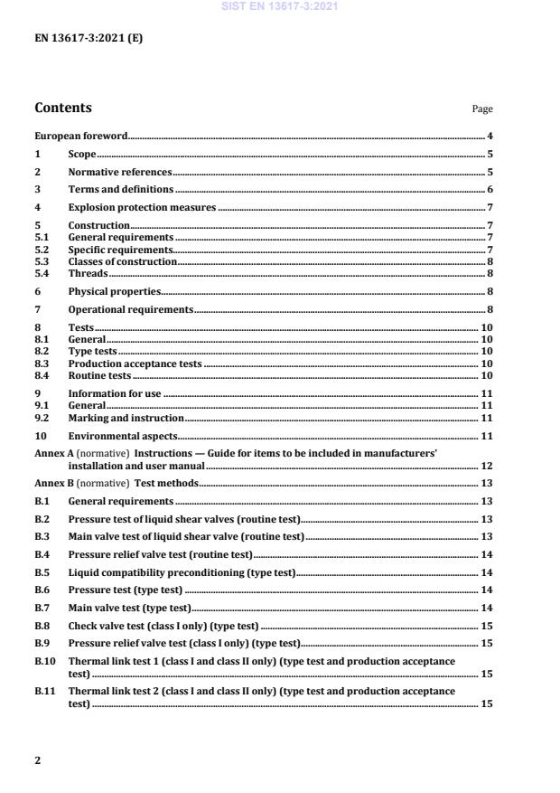 - Annex B lists detailed test methods (pressure, main valve closure, thermal link, liquid compatibility).
