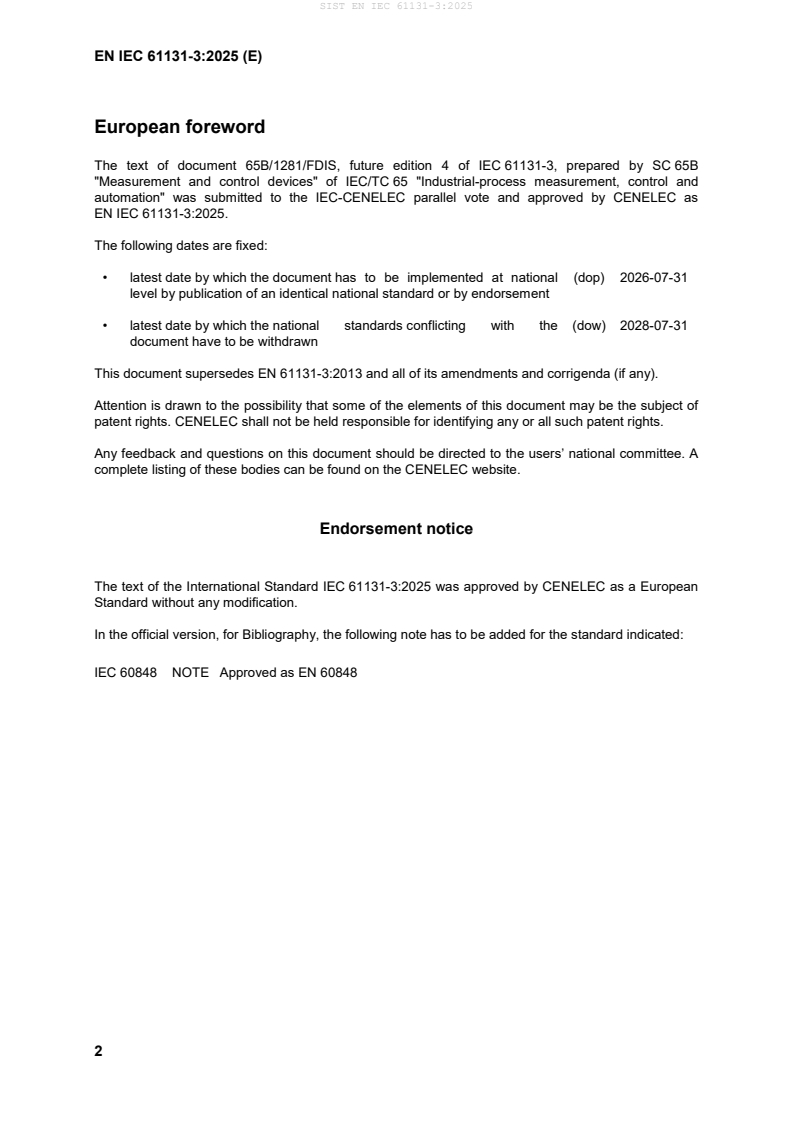 The SIST EN IEC 61131-3:2025 standard provides a comprehensive framework for the programming languages utilized in programmable controllers (PCs). Its scope encompasses the syntax and semantics necessary for implementing consistent and effective programming practices as defined in IEC 61131-1. One of the notable strengths of this standard is its unified suite of programming languages, which includes structured text (ST) alongside graphical languages such as ladder diagram (LD) and function block diagram (FBD). This diversity allows programmers to select the most suitable language for their application needs, enhancing flexibility and usability in different automation contexts. Furthermore, the inclusion of sequential function chart (SFC) adds another layer of structure for program management, making it easier to organize and visualize complex automation tasks. Additionally, the standard addresses critical features that ensure effective communication among programmable controllers and other components within automated systems. This capability is essential for modern industrial applications where interconnected systems must operate seamlessly. The 2025 edition incorporates significant technical advancements that improve its relevance and application. Notably, the introduction of UTF-8 strings and their associated functions reflects the need for modern data handling and internationalization within programming practices. Moreover, Annex B provides transparency regarding the evolutionary changes made to the standard, offering users clear insights into newly added, removed, or deprecated features compared to its 2013 predecessor. Overall, SIST EN IEC 61131-3:2025 stands out as an essential standard in the domain of programmable controllers, facilitating effective programming and enhancing communication across automated systems. Its structured approach and updates position it as a crucial reference for professionals in the field.