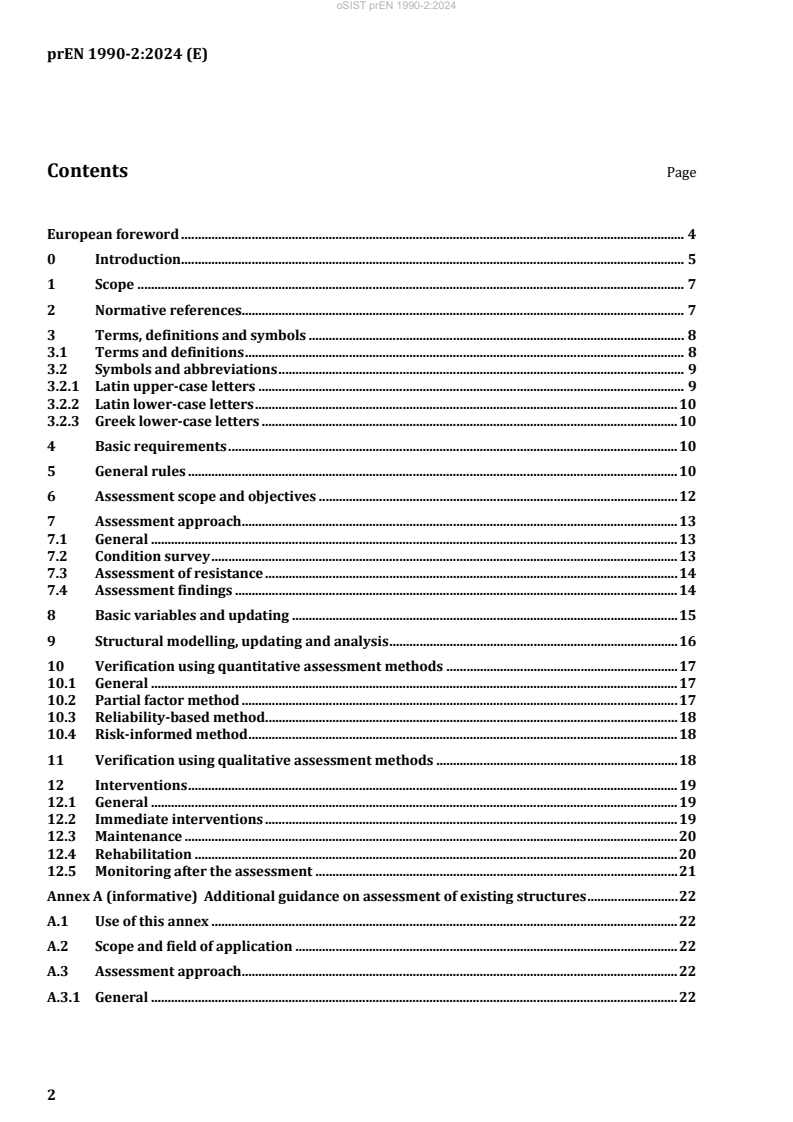 The document oSIST prEN 1990-2:2024 serves a crucial role in establishing procedures for the assessment of existing structures, which includes both structural and geotechnical considerations. The scope clearly defines its purpose to complement the foundational aspects provided by prEN 1990-1, ensuring that existing frameworks can be evaluated against robust and consistent criteria that reflect the principles of structural reliability. One of the primary strengths of this standard is its comprehensive approach to the assessment process. It delineates the general principles for interventions that should be applied when assessing existing structures, enabling professionals to better understand the necessary considerations without delving into material-specific technical provisions. This strategic focus allows for a streamlined assessment process that aligns with the overarching goals of structural safety and performance. Additionally, the inclusion of general principles regarding actions for assessment, in tandem with the established EN 1991 (all parts), enhances the relevance of the standard in practical applications. By outlining the necessary correlations between existing assessments and actions, practitioners can ensure their methodologies adhere to established norms while also considering the unique challenges posed by prior developments. It is noteworthy that the standard specifically excludes the design of new structural parts, placing emphasis on its intended use for existing structures. This targeted scope invites clarity, helping stakeholders to navigate interventions without confusion regarding design formulations that may inadvertently diverge from the assessment’s primary goals. Furthermore, while the document does not address seismic assessment and retrofitting directly, it guides users toward EN 1998-3 for related protocols. This interconnectedness reinforces the standard's utility by providing a pathway for those in need of additional guidance on seismic considerations, ensuring that practitioners have access to comprehensive information for all aspects of structural safety. In conclusion, oSIST prEN 1990-2:2024 presents a focused and substantive framework for the assessment of existing structures. Its clarity of scope, strengths in aligning with existing standards, and relevance in contemporary structural engineering practices make it an indispensable resource for professionals tasked with enhancing the safety and integrity of existing infrastructure.