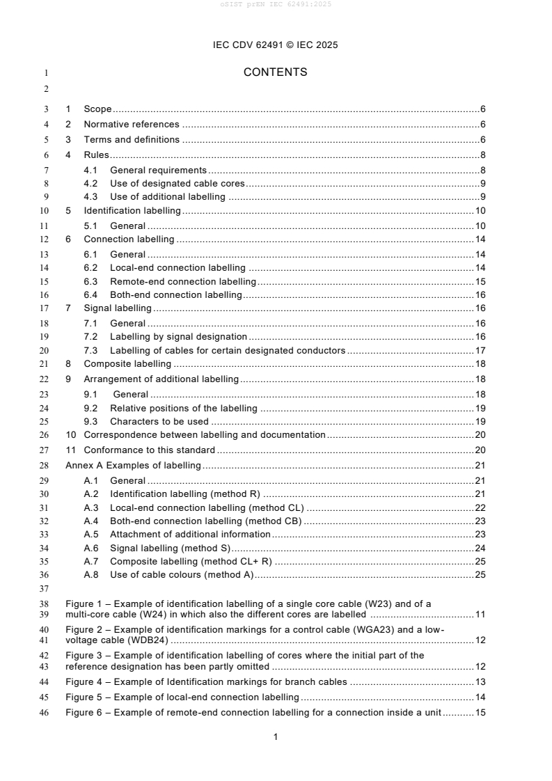 prEN IEC 62491:2025 (IEC 62491 Ed.2) is the updated IEC/CENELEC committee draft for labelling of cables and cores used in industrial systems, installations, equipment and industrial products. This second edition broadens the original 2008 standard to cover optical cables/fibres, connectors, digital and intermediate markings, bi‑colour conductor combinations, branch cables and the use of three‑letter cable type reference codes (from IEC 81346-2). The standard is developed by IEC TC 3 (Documentation, graphical symbols and representations of technical information) and is intended to improve unambiguous identification of cables and conductors across lifecycle phases (assembly, production, service, maintenance).