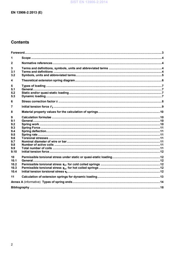 NOTE In cases of substantially higher or lower working temperature, it is advisable to seek the manufacturer’s advice. 2 Normative references The following documents, in whole or in part, are normatively referenced in this document and are indispensable for its application. For dated references, only the edition cited applies. For undated references, the latest edition of the referenced document (including any amendments) applies. EN 10270-1, Steel wire for mechanical springs — Part 1: Patented cold drawn unalloyed spring steel wire EN 10270-2, Steel wire for mechanical springs — Part 2: Oil hardened and tempered spring steel wire EN 10270-3, Steel wire for mechanical springs — Part 3: Stainless spring steel wire EN 10089, Hot-rolled steels for quenched and tempered springs — Technical delivery conditions EN 12166, Copper and copper alloys — Wire for general purposes EN ISO 26909:2010, Springs — Vocabulary (ISO 26909:2009) ISO 26910-1, Springs — Shot peening — Part 1: General procedures 3 Terms and definitions, symbols, units and abbreviated terms 3.1 Terms and definitions For the purposes of this document, the terms and definitions given in EN ISO 26909:2010 and the following apply. 3.1.1 spring mechanical device designed to store energy when deflected and to return the equivalent amount of energy when released [SOURCE: EN ISO 26909:2010, 1.1] 3.1.2 extension spring spring (1.1) that offers resistance to an axial force tending to extend its length, with or without initial tension [SOURCE: EN ISO 26909:2010, 1.3] SIST EN 13906-2:2014
