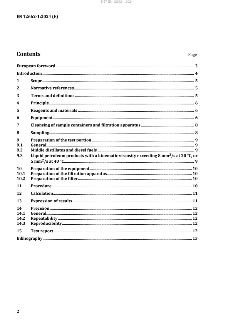 Ta evropski standard določa metodo za določanje vsebnosti neraztopljenih snovi (celokupnih nečistoč) v srednjih destilatih, dizelskem gorivu, ki vsebuje do 30 % (V/V) metilnih estrov maščobnih kislin (FAME), in v čistih metilnih estrih maščobnih kislin. Delovno območje je od 12 do 30 mg/kg in je bilo določeno z medlaboratorijsko študijo ob upoštevanju standarda EN ISO 4259 [2].