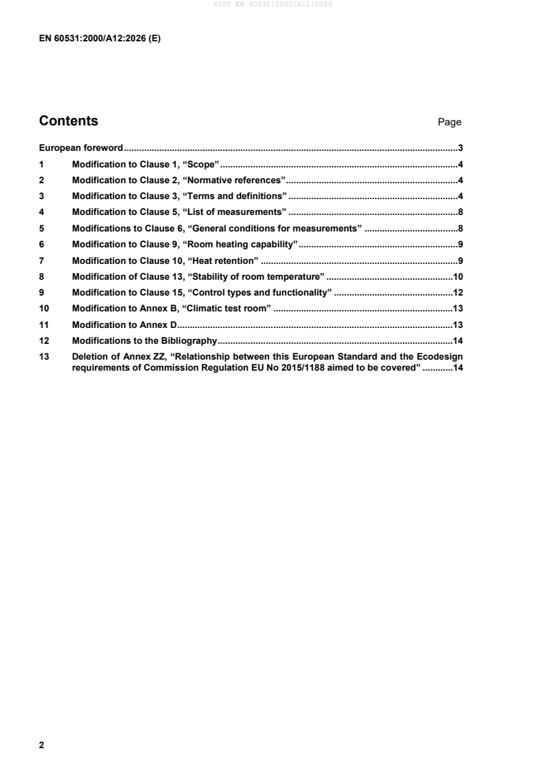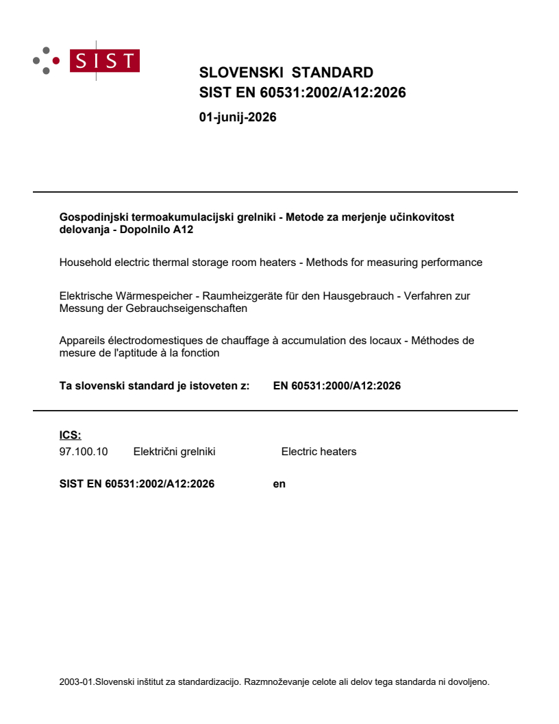 SIST EN 60531:2002/A12:2026 is a amendment published by the Slovenian Institute for Standardization (SIST). Its full title is "Household electric thermal storage room heaters - Methods for measuring performance". This standard covers: Applies to electric storage heaters intended to heat the room in which they are located. It defines the main performance characteristics and describes methods for measuring these characteristics. It does not apply to heating appliances incorporated in the building structure, to central heating systems or to floor heating appliances.