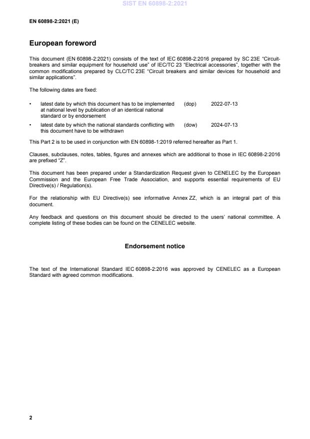 EN 60898-2:2021 is the CLC/CENELEC adoption of IEC 60898-2:2016 (modified) and forms Part 2 of the series for miniature circuit-breakers used in household and similar installations. It is intended to be used in conjunction with EN 60898-1:2019 (Part 1) and defines additional requirements, tests and marking rules specifically for circuit‑breakers designed for both AC and DC operation. This edition (approved July 2021) updates earlier national editions and aligns requirements for modern low‑voltage residential and similar applications, including systems with DC sources (e.g., battery storage, PV, EV).