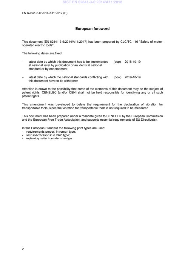 This amendment A11 modifies the European Standard EN 62841-3-6:2014; it was approved by CENELEC on 2017-10-19. CENELEC