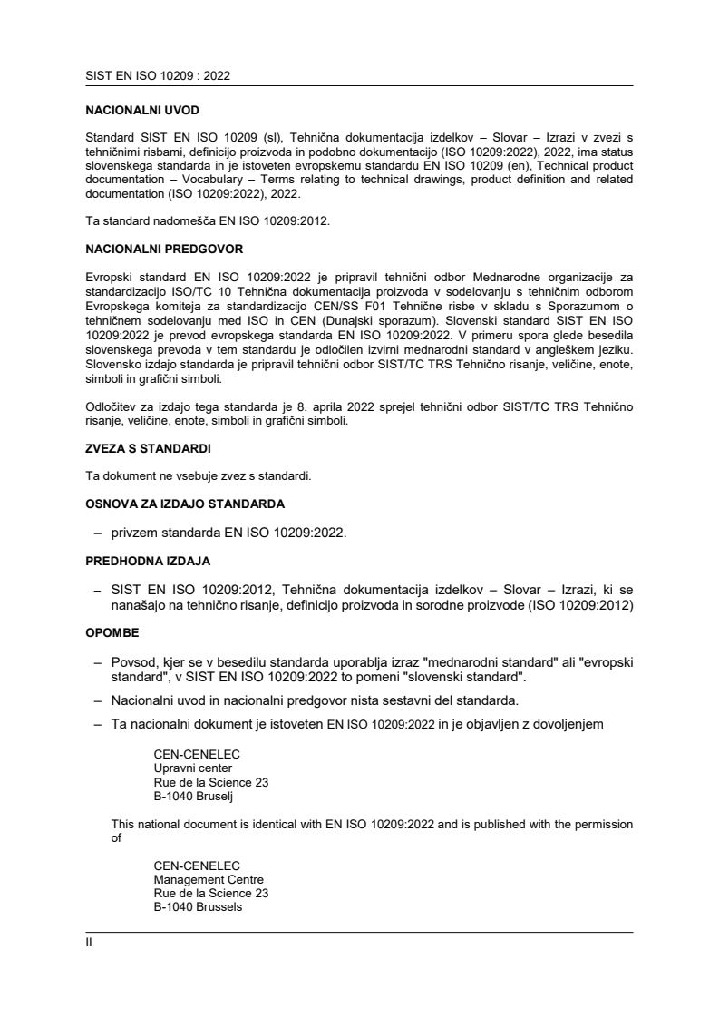 SIST EN ISO 10209:2022 (ISO 10209:2022) is the international vocabulary standard for technical product documentation, specifically defining terms related to technical drawings, product definition and related documentation across all fields of application. This second edition (2022) replaces the 2012 edition and organizes terminology into classified fields to support consistent use of language in engineering, design, manufacturing and documentation workflows. The standard is maintained by ISO/TC 10 and updated terms are ratified by the ISO/TC 10 vocabulary maintenance team.