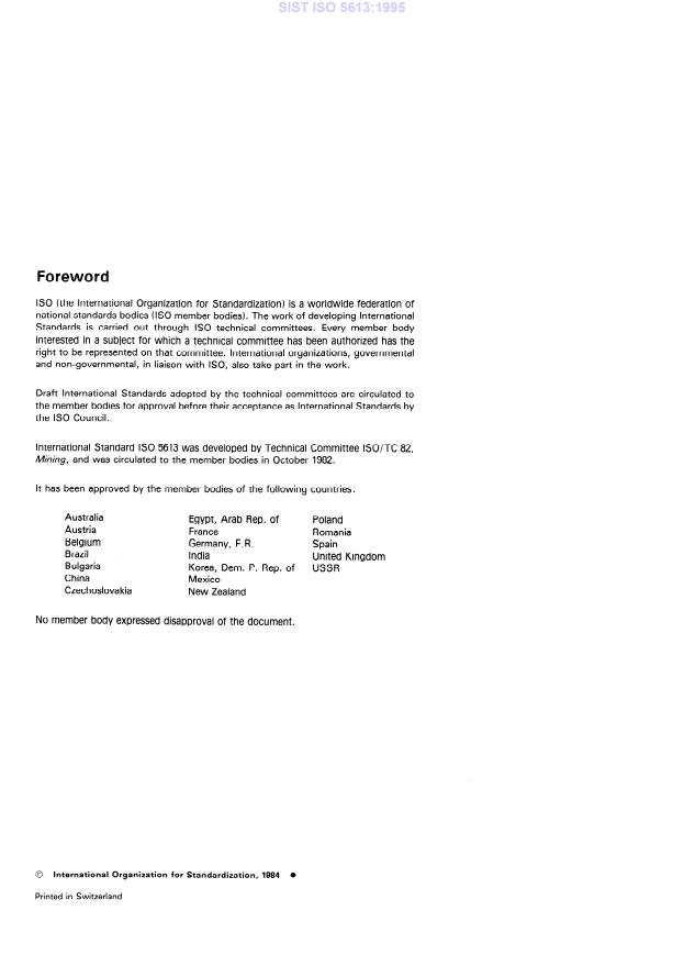 Foreword IS0 (the International Organization for Standardization) is a worldwide federation of national standards bodies (IS0 member bodies). The work of developing International Standards is carried out through IS0 technical committees. Every member body interested in a subject for which a technical committee has been authorized has the right to be represented on that committee. International organizations, governmental and non-governmental, in liaison with ISO, also take part in the work. Draft International Standards adopted by the technical committees are circulated to the member bodies for approval before their acceptance as International Standards by the IS0 Council. International Standard IS0 5613 was developed by Technical Committee ISO/TC 82, Mining, and was circulated to the member bodies in October 1982. It has been approved by the member bodies of the following countries: Australia Egypt, Arab Rep. of Poland Austria France Romania Belgium Germany, F. R. Spain Brazil India United Kingdom Bulgaria Korea, Dem. P. Rep. of USSR China Mexico Czechoslovakia New Zealand No member body expressed disapproval of the document. 0 International Organization for Standardization, 1984 Printed in Switzerland SIST ISO 5613:1995