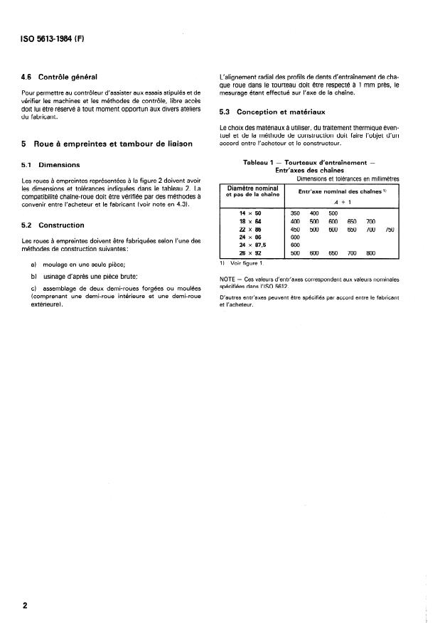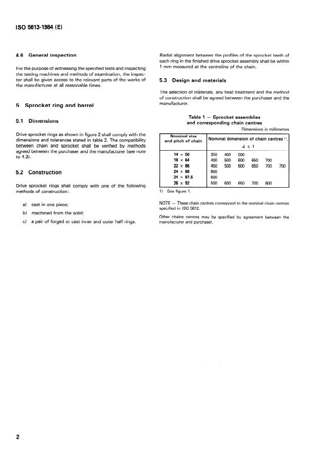 INTERNATIONAL STANDARD IS0 5613-1984 (E) Mining - Drive sprocket assemblies for chain conveyors 1 Scope and field of application This International Standard specifies the requirements for a range of sprocket assemblies for use with twin outboard chain assemblies for chain conveyors. These assemblies incorporate sprocket rings designed to accept chains complying with IS0 610, shackle type connectors complying with IS0 1082 and scraper bars complying with IS0 5612. 2 References IS0 610, High-tensile steel chains (round link) for chain con- ve yors and coal ploughs. IS0 1082, Mining - Shackle type connector units for chain conveyors. IS0 5612, Mining - Scraper bars for chain conveyors. 3 Definitions For the purpose of definitions apply : this International Standard, the following 3.1 drive sprocket assembly: An arrangement which com- prises the drive sprocket rings and connecting barrel, shown in figure 1, or a barrel incorporating integral drive sprocket rings. 3.2 drive sprocket ring: A toothed wheel by which the chain of a chain conveyor is driven. 3.3 connecting barrel: A cylindrical spacer between two drive sprocket rings. 3.4 sprocket pocket: That part of a complete sprocket ring into which either a chain link or shackle type connector sits. 35 . inspector: The representative of the purchaser. 4 Drive sprocket assembly 4.1 Design Drive sprocket assemblies as shown in figure 1 shall conform to the dimensions and tolerances stated in tables 1 and 2 which are based on the design formulae given in the annex. Unless otherwise specified by the purchaser and having regard to these limitations, it is the manufacturer’s responsibility to en- sure that the assembly and its components shall be of adequate strength for the duty which they are required to perform, when related to the dimensions and mechanical properties of the ap- propriate chain (see IS0 610). 4.2 Assembly When constructing the drive sprocket assembly shown in figure 1, the profiles of each complete sprocket ring shall be aligned with the other within the permitted tolerances stated in 5.1. Where applicable, care shall be taken to adopt the correct welding procedure for the steels used for the sprocket rings and the barrel. 4.3 Dimensional tests The dimensions for each sprocket assembly given in table 2 shall be verified by methods agreed between the purchaser and the manufacturer. NOTE - An associated guidance document on methods of verifying sprocket dimensions is being prepared. 4.4 Workmanship Where applicable, all welds shall be smoothly finished, and on visual examination, have no harmful fissures, notches or other imperfections. Magnetic and/or fluorescent crack deflection, gamma radiography or other forms of non-destructive testing shall be specified only by agreement between purchaser and manufac- turer. Such methods of testing and the criteria to be applied shall be clearly defined and agreed at the time of the enquiry and order. 4.5 Marking Each sprocket assembly shall be visibly and permanently marked with a) the manufacturer’s registered trade name or trade mark; b) the size and pitch of chain and the chain centres (see table 1); c) any other marking as agreed between the purchaser and the manufacturer. SIST ISO 5613:1995