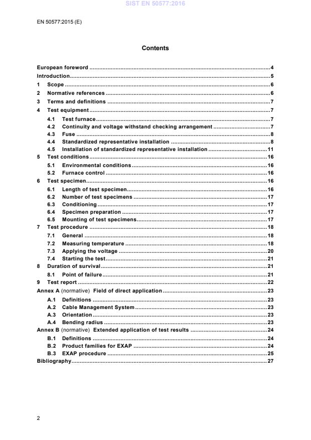 SIST EN 50577:2016 is a standard published by the Slovenian Institute for Standardization (SIST). Its full title is "Electric cables - Fire resistance test for unprotected electric cables (P classification)". This standard covers: This European Standard specifies a test method to evaluate the maintenance of circuit integrity of electric cables which have intrinsic resistance to fire under fire conditions, in order to classify the electric cable according to EN 13501-3 [2]. The test determines the survival time for circuit integrity of the electric cable when exposed to fire under the conditions of the EN 1363-1 standard time/temperature curve. This European Standard is used in conjunction with EN 1363-1. This European Standard applies to electric power and control cables with rated voltage up to and including 600/1 000 V. The cable is tested in a standardized representative installation condition. The test does not assess the performance of the cable management system. NOTE Optical and data cables could be tested using this method but do not form part of this European Standard as the verification procedures for such cables are still under development. This European Standard includes (Annex A) field of direct application and rules for extended application of test results (EXAP).