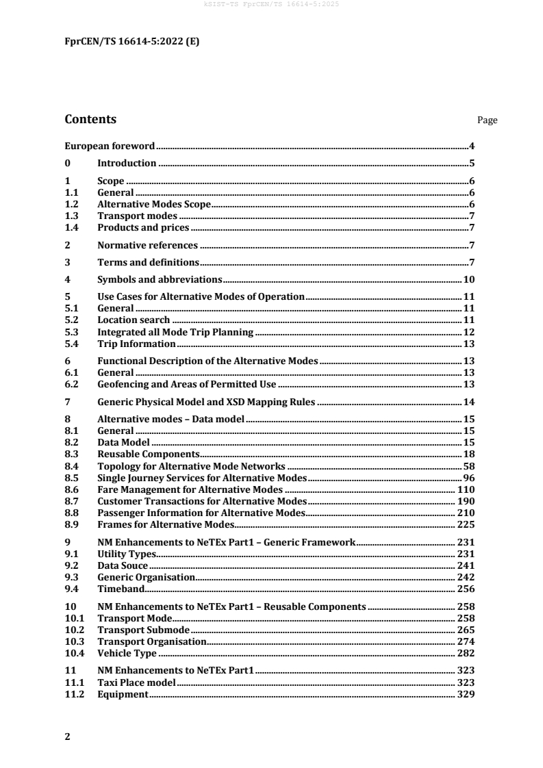 kSIST-TS FprCEN/TS 16614-5:2025 is a draft published by the Slovenian Institute for Standardization (SIST). Its full title is "Public transport - Network and timetable exchange (NeTEx) - Part 5: Alternative modes exchange format". This standard covers: 16614 (NeTEx) is composed of a series of standards: - Part 1: Description of the public transport network topology exchange format. - Part 2: Description of the scheduled timetables exchange format. - Part 3: Description of the fare information exchange format. - Part 4: Description of the passenger information European profile (EPIP). - Part 5: Description of the alternative modes exchange format. - Part 6: Description of the accessibility European profile (EPIAP). The present update concerns Part 3. All the parts will be updated together, except Part 6 currently under formal vote (a NWI is produced for each Part). This update is done in a similar timeframe as the Transmodel (EN12896) revision, to achieve the best possible consistency. The updated version of TS 16614 is going to be published as NeTEx v2. The global updates consist in the following main extensions/enhancements: - Deck plan allowing for a digitalised representation of spaces and equipment on board vehicles (with considerations of accessibility features), - Physical layout of compound vehicles (e.g. train composition), - Multiple minor enhancements, adjustments, and fixes to consider all the feedback from the previous versions of NeTEx, especially in the context of the European Delegated Regulation EU 2017/1926 Consistency and coherences with Transmodel and SIRI and OJP have also been challenged and minor updates are to be integrated in this revision.