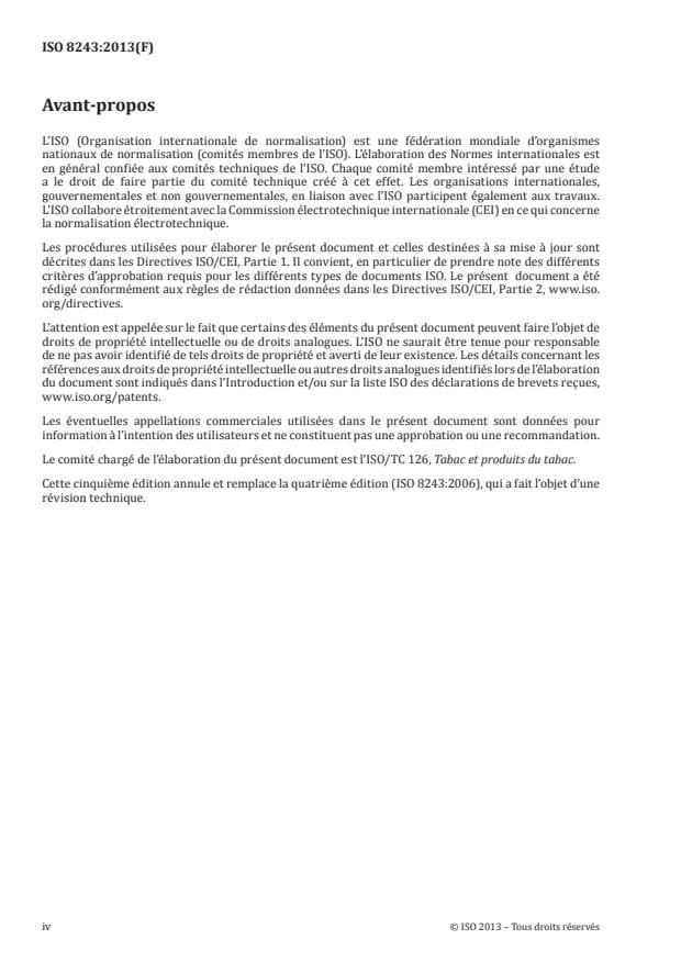 ISO 8243:2013 specifies two methods of providing representative samples of a population of cigarettes manufactured for sale. Different procedures are specified according to whether sampling is undertaken at the point of sale or at a factory.