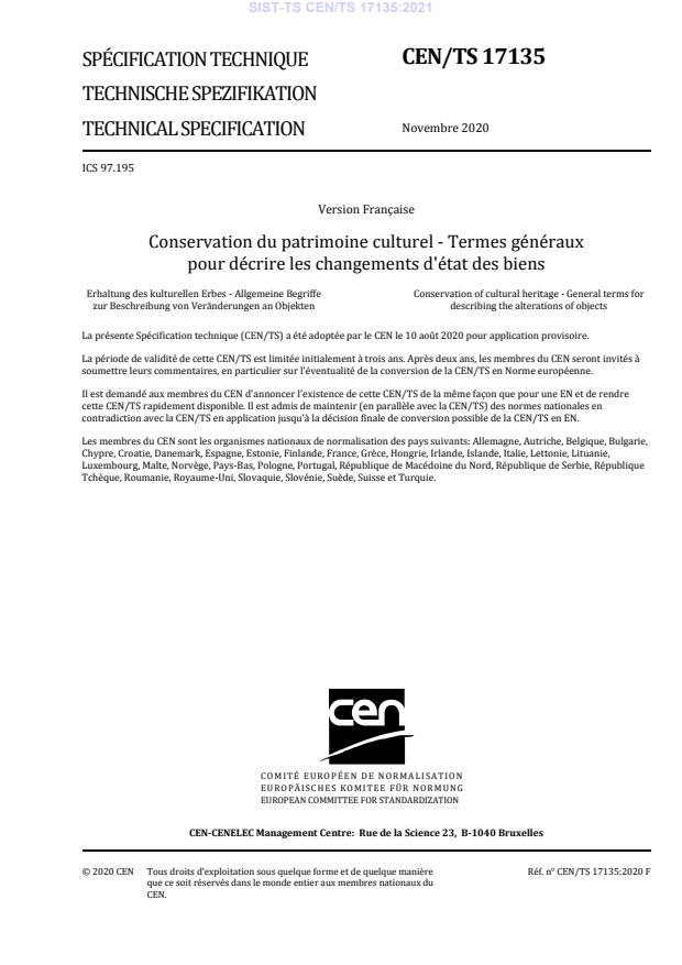 SIST-TS CEN/TS 17135:2021 is a technical specification published by the Slovenian Institute for Standardization (SIST). Its full title is "Conservation of cultural heritage - Generale terms for describing the alterations of objects". This standard covers: This document defines terms used in the field of conservation of cultural heritage for the description of alteration of objects with particular attention to those terms which are applied to many types of objects. This document applies to all types of material changes that can be observed.