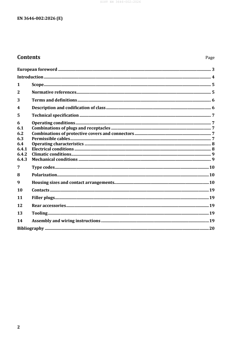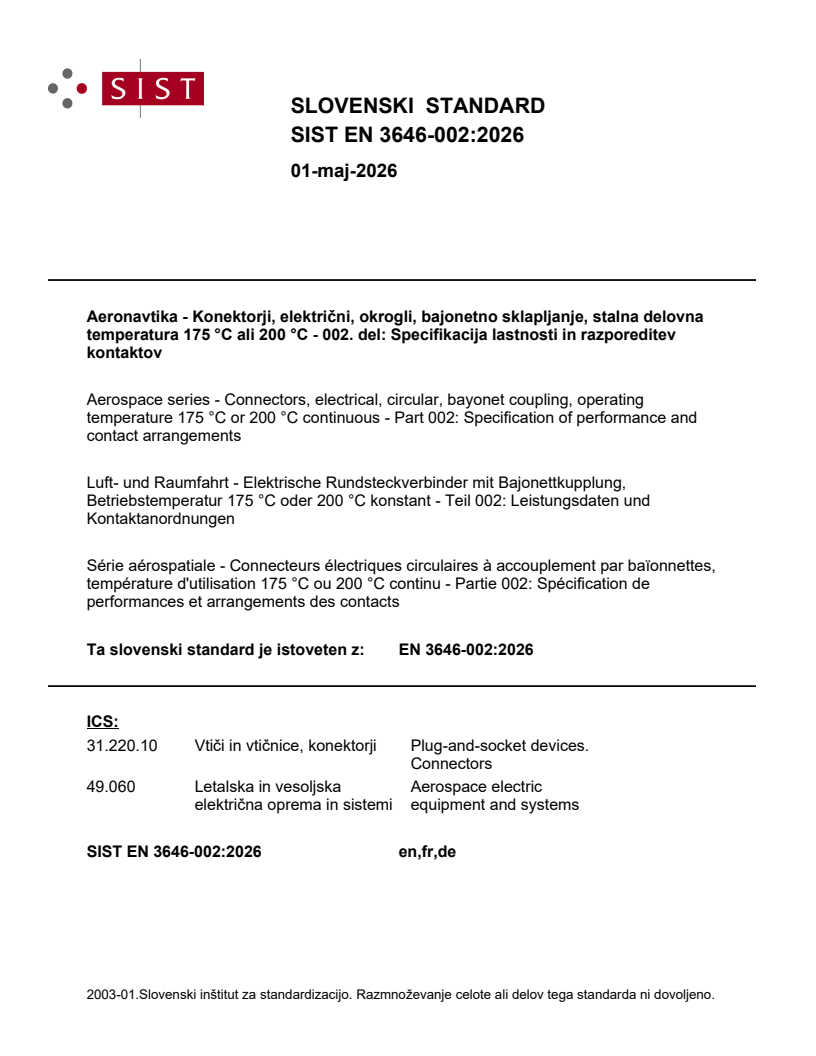 SIST EN 3646-002:2026 is a standard published by the Slovenian Institute for Standardization (SIST). Its full title is "Aerospace series - Connectors, electrical, circular, bayonet coupling, operating temperature 175 °C or 200 °C continuous - Part 002: Specification of performance and contact arrangements". This standard covers: This document specifies the performances and contact arrangements groups for bayonet coupling circular connectors, intended for use in an operating temperature range of −65 °C to 175 °C or 200 °C continuous.