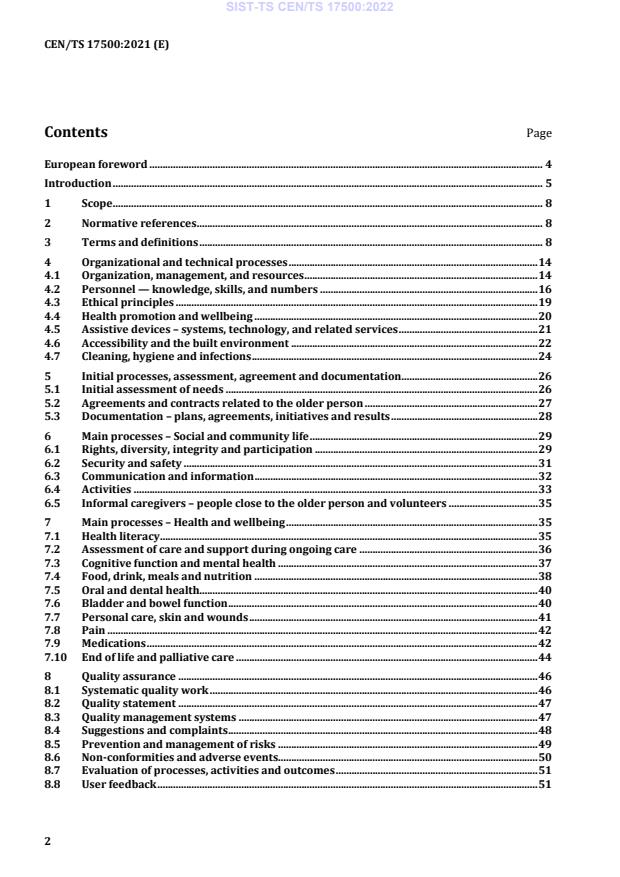CEN/TS 17500 structures quality of care around organizational processes and practical care domains. Key technical topics include: