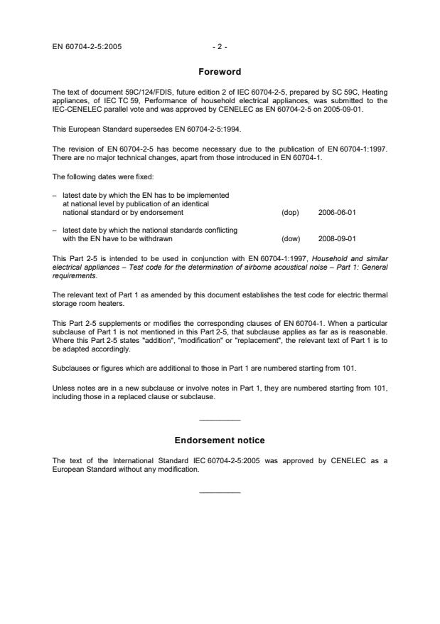 EN 60704-2-5:2005 (adopting IEC 60704-2-5:2005) is the Part 2-5 supplement to the airborne acoustical noise test code for electric thermal storage room heaters. It specifies particular requirements for noise testing of forced‑convection storage heaters designed for floor placement, wall‑mounting or building‑in. The Part 2-5 document is intended to be used together with EN/IEC 60704-1 (general requirements) and focuses on practical, reproducible determination of airborne noise from these appliances.