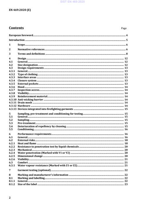 SIST EN 469:2020 is a standard published by the Slovenian Institute for Standardization (SIST). Its full title is "Protective clothing for firefighters - Performance requirements for protective clothing for firefighting activities". This standard covers: This document specifies minimum performance requirements for protective clothing designed to be worn during firefighting activities. The requirements detailed in this document cover design, heat and flame, mechanical, chemical, comfort, and visibility. This document covers the general clothing design, the minimum performance levels of the material used, the methods of test to be used to determine these performance levels, marking and information supplied by the manufacturer. This document makes distinction between firefighting activities dividing them into two performance levels based on a risk assessment: - Level 1: specifies the minimum requirements for firefighting clothing involving work associated with outdoor firefighting and their support activities, taking into account the environments and conditions of the expected operational scenarios of such firefighting activities. The level 1 is not applicable for protection against risks encountered in fighting fires or rescue from fire activities in structures, unless combined to a level 2 or other specialized PPE. - Level 2: specifies the minimum requirements for firefighting clothing for risks encountered in fighting fires and rescue from fire in structures. The distinction between Level 1 and Level 2 clothing is restricted to the requirements for heat and flame (X1 or X2 - Heat and Flame). These levels of protection can be reached by a single garment or a combination of separate garments. Additional marking provides two grades of protection for Y (protection against water penetration) and Z (water vapour resistance). It is essential that these performance grades are indicated on the marking of the clothing and explained in the instructions for use. This document does not cover protective clothing for wildland firefighting, specialized firefighting in a high amount of radiant heat where reflective clothing is required and/or advanced technical rescue operations dealing with hazardous chemicals, working with chainsaws and water and rope rescue. This document does not cover protection for the head, hands and feet or specific protection against other hazards e.g. chemical, biological, radiological and electrical hazards. These aspects may be covered in other European Standards.