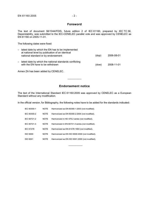 2008-11-01 Annex ZA has been added by CENELEC. __________ Endorsement notice The text of the International Standard IEC 61160:2005 was approved by CENELEC as a European Standard without any modification. In the official version, for Bibliography, the following notes have to be added for the standards indicated: