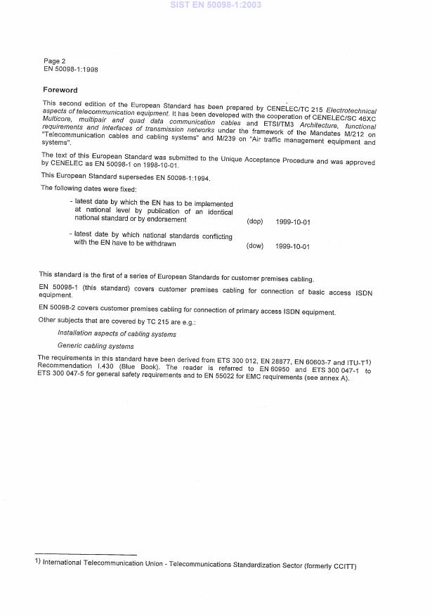 Keywords: EN 50098-1:1998, customer premises cabling, ISDN basic access, CLC, premises cabling standard, ISDN cabling, ISO/IEC DIS 14709-1.