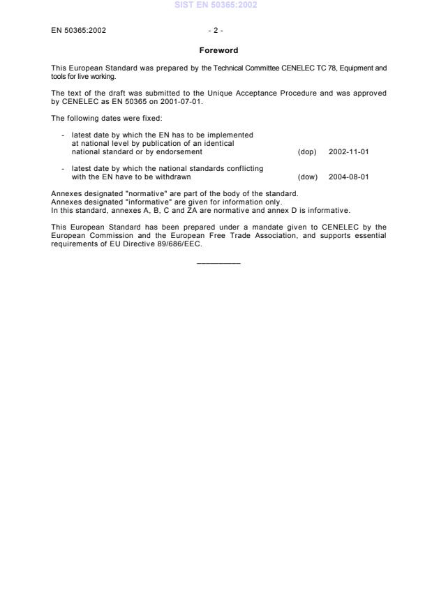 - 3 -EN 50365:2002Contents1Scope.42Normative references.43Definitions.54Classification.55Requirements.55.1General.55.2Non-electrical requirements.55.3Electrical requirements.55.4Marking.65.5Packaging.65.6Instructions for use.66Tests.66.1General.66.2Non-electrical tests.66.3Electrical tests.76.4Marking.86.5Packaging.87Quality assurance plan and acceptance tests.87.1General.87.2Sampling procedure.87.3Acceptance tests.8Annex A (normative) General test procedure.11Annex B (normative) Instructions for use.12Annex C (normative) Sampling procedure.13Annex D (informative) Acceptance tests.15FiguresFigure 1 - Arrangement for electrical tests.9Figure 2 - Marking.10TablesTable 1 - Proof test voltage, proof test current and withstand test voltage.8Table A.1 - Sequence of tests.11Table C.1 - Classification of defects.13Table C.2 - Major defects.13Table C.3 - Minor defects.14SIST EN 50365:2002
