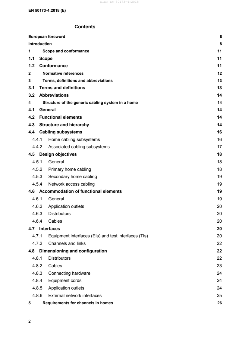 EN 50173-4:2018 - Information technology: Generic cabling systems - Part 4: Homes - specifies generic cabling infrastructure for residential premises. It covers homes that may consist of one or more buildings or be part of a multi-dwelling building. The standard addresses balanced cabling, optical fibre cabling, and coaxial cabling, and defines how cabling should support two application groups: Information and Communications Technologies (ICT) and Broadcast and Communications Technologies (BCT).