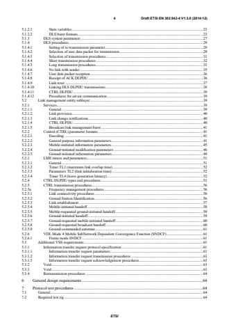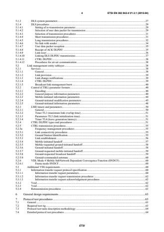 ETSI ETSI EN 302 842-4 V1.3.1 (2015-04) 4 5.1.3 DLS system parameters . 27 5.1.4 DLS procedures . 29 5.1.4.1 Setting of re-transmission parameter . 29 5.1.4.2 Selection of user data packet for transmission . 29 5.1.4.3 Selection of transmission procedures . 31 5.1.4.4 Short transmission procedures . 31 5.1.4.5 Long transmission procedures . 32 5.1.4.6 No link with sender . 34 5.1.4.7 User data packet reception . 35 5.1.4.8 Receipt of ACK DLPDU . 35 5.1.4.9 Link reset . 36 5.1.4.10 Linking DLS DLPDU transmissions . 37 5.1.4.11 CTRL DLPDU . 38 5.1.4.12 Procedures for air-air communication . 38 5.2 Link management entity sublayer. 38 5.2.1 Services . 38 5.2.1.1 General . 38 5.2.1.2 Link provision . 39 5.2.1.3 Link change notifications . 39 5.2.1.4 CTRL DLPDU . 39 5.2.1.5 Broadcast link management burst . 40 5.2.2 Control (CTRL) parameter formats . 40 5.2.2.1 Encoding . 40 5.2.2.2 General purpose information parameters . 40 5.2.2.3 Mobile-initiated information parameters . 44 5.2.2.4 Ground-initiated modification parameters . 45 5.2.2.5 Ground-initiated information parameters . 48 5.2.3 LME timers and parameters . 50 5.2.3.1 General . 50 5.2.3.2 Timer TL1 (maximum link overlap time) . 51 5.2.3.3 Parameters TL2 (link initialization time) . 51 5.2.3.4 Timer TL4 (leave generation latency) . 51 5.2.4 CTRL DLPDU types and procedures . 51 5.2.5 CTRL transmission procedures . 55 5.2.5a Frequency management procedures . 55 5.2.5.1 Link connectivity procedures . 55 5.2.5.2 Ground Station Identification . 55 5.2.5.3 Link establishment . 56 5.2.5.4 Mobile-initiated handoff . 57 5.2.5.5 Mobile-requested ground-initiated handoff . 58 5.2.5.6 Ground-initiated handoff . 58 5.2.5.7 Ground-requested mobile-initiated handoff . 59 5.2.5.8 Ground-requested broadcast handoff . 59 5.2.5.9 Ground-commanded autotune . 60 5.2.6 VDL Mode 4 Mobile SubNetwork Dependent Convergence Function (SNDCF) . 60 5.2.6.1 Frame mode SNDCF . 60 5.3 Additional VSS requirements . 60 5.3.1 Information transfer request protocol specification . 60 5.3.1.1 Information transfer request parameters . 60 5.3.1.2 Information transfer request transmission procedures . 62 5.3.1.3 Information transfer request acknowledgement procedures . 62 5.3.2 Void . 62 5.3.3 Void . 62 5.3.4 Retransmission procedures . 63 6 General design requirements . 63 7 Protocol test procedures . 63 7.1 General . 63 7.2 Required test rig . 63 7.3 Protocol test-suite description methodology . 64 7.4 Detailed protocol test procedures . 64 SIST EN 302 842-4 V1.3.1:2015