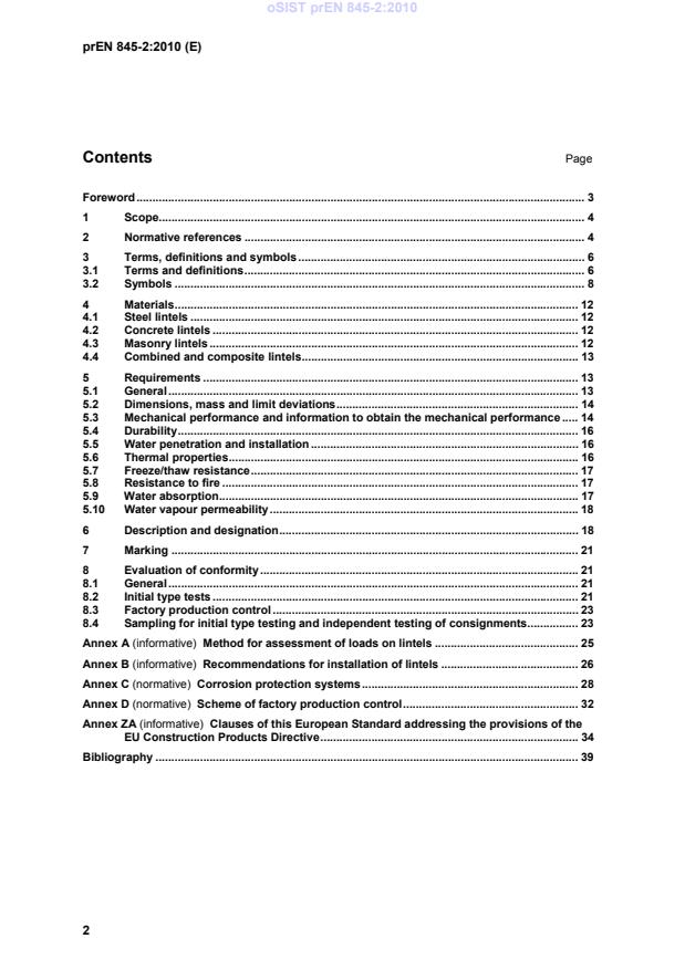 oSIST prEN 845-2:2010 is a draft published by the Slovenian Institute for Standardization (SIST). Its full title is "Specification for ancillary components for masonry - Part 2: Lintels". This standard covers: This part of EN 845 specifies requirements for prefabricated lintels up to a maximum clear span of 4,5 m made from autoclaved aerated concrete, fired clay units, calcium silicate units, natural or manufactured stone, concrete and steel or using a combination of these materials. Product characteristics linked to ER1 are flexural resistance, shear load resistance and stiffness.