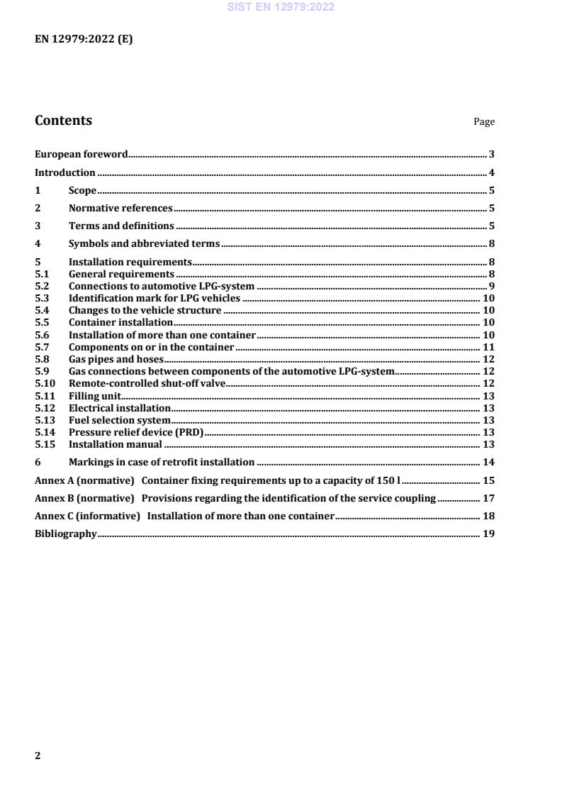 SIST EN 12979:2022 is a standard published by the Slovenian Institute for Standardization (SIST). Its full title is "LPG equipment and accessories - Automotive LPG-systems - Installation requirements". This standard covers: This document specifies the requirements for the installation of automotive LPG components that comply with EN 12805 and EN 12806. These requirements are to ensure safe operation of such components. This document does not cover type approval of LPG motor vehicles. NOTE Type approval requirements are covered in UN/ECE Regulations and EU legislation.