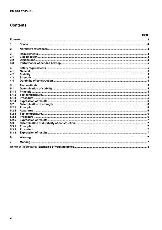 EN 916:2003 is a CEN European Standard for gymnastic equipment that specifies requirements and test methods for vaulting boxes, including safety provisions. It defines functional characteristics, classification by design, dimensional limits for padded top surfaces, and specific safety tests for stability, strength and durability. EN 916:2003 is intended to be read in conjunction with EN 913 (general safety requirements for gymnastic equipment).