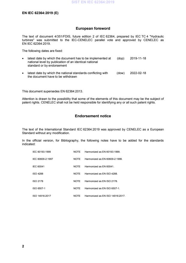 SIST EN IEC 62364:2019 (IEC 62364:2019) is the international guideline for managing hydro‑abrasive erosion in Kaplan, Francis and Pelton turbines. This second edition (2019) updates the 2013 edition and is available as IEC 62364:2019 RLV (International Standard with redline showing changes). The standard provides structured guidance for collecting erosion data, predicting wear, specifying resistant materials and coatings, and for design, operation and maintenance measures to minimize erosion in hydraulic machines.