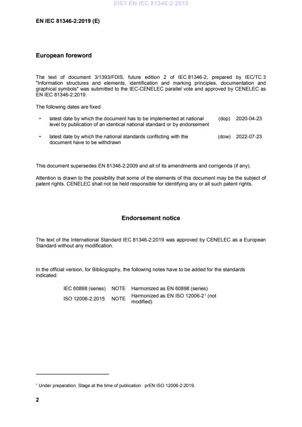 SIST EN IEC 81346-2:2019 has the following relationships with other standards: It is inter standard links to SIST EN 81346-2:2009, oSIST prEN 81346-2:2025. Understanding these relationships helps ensure you are using the most current and applicable version of the standard.