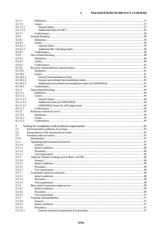 ETSI ETSI EN 301 908-18 V11.1.1 (2016-07) 5 5.3.5.2.2 Additional minimum requirement (BC1 and BC2) test procedure . 53 5.3.5.2.3 Additional minimum requirement (BC3) test procedure . 54 5.3.5.3 Test requirement . 54 5.3.6 Receiver spurious emissions . 54 5.3.6.1 Initial conditions . 54 5.3.6.2 Procedure . 55 5.3.6.3 Test requirement . 55 5.3.7 In-band blocking . 55 5.3.7.1 Initial conditions . 55 5.3.7.2 Procedure . 55 5.3.7.2.1 Procedure for general blocking . 55 5.3.7.2.2 Procedure for additional BC3 blocking requirement . 56 5.3.7.3 Test requirement . 56 5.3.8 Out-of-band blocking . 56 5.3.8.1 Initial conditions . 56 5.3.8.2 Procedure . 57 5.3.8.3 Test requirement . 57 5.3.9 Receiver intermodulation characteristics . 57 5.3.9.1 Initial conditions . 57 5.3.9.2 Procedure . 58 5.3.9.2.1 Procedure for general and narrowband intermodulation . 58 5.3.9.2.2 Procedure for additional narrowband intermodulation for GSM/EDGE . 58 5.3.9.3 Test requirement . 58 5.3.10 Narrowband blocking . 58 5.3.10.1 Initial conditions . 58 5.3.10.2 Procedure . 59 5.3.10.2.1 Procedure for narrowband blocking . 59 5.3.10.2.2 Procedure for additional narrowband blocking for GSM/EDGE . 59 5.3.10.2.3 Procedure for GSM/EDGE AM suppression . 59 5.3.10.3 Test requirement . 59 5.3.11 Reference sensitivity level . 60 5.3.11.1 General . 60 5.3.11.2 Test requirement . 60 Annex A (normative): Relationship between the present document and the essential requirements of Directive 2014/53/EU . 61 Annex B (normative): Base Station configurations . 62 B.1 Reception with multiple receiver antenna connectors and receiver diversity . 62 B.2 Duplexers . 62 B.3 Power supply options . 62 B.4 Ancillary RF amplifiers . 62 B.5 BS using antenna arrays . 63 B.5.0 General . 63 B.5.1 Receiver tests . 63 B.5.2 Transmitter tests . 64 B.6 Transmission with multiple transmitter antenna connectors . 64 B.7 BS with integrated Iuant BS modem . 64 Annex C (informative): Environmental profile specification . 65 Annex D (informative): Bibliography . 66 History . 67