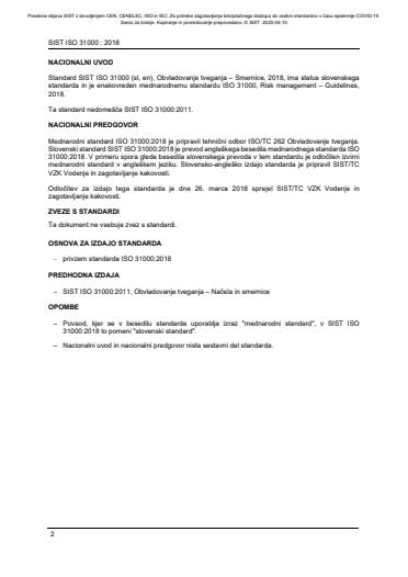 Slovenski standard SIST ISO 31000:2018 je prevod angleškega besedila mednarodnega standarda ISO