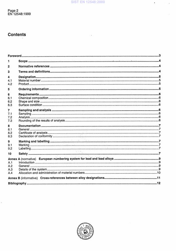 Keywords: EN 12548:1999, lead alloy ingots, electric cable sheathing, lead alloys, sampling and analysis, chemical composition, marking and labelling.