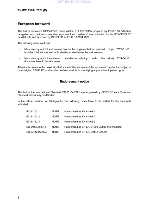SIST EN IEC 63154:2021 (IEC 63154:2021) is an international standard that defines cybersecurity general requirements, test methods and required test results for maritime navigation and radiocommunication equipment. It provides a baseline - a basic level of protection - against cyber incidents (malicious attempts affecting equipment, networks or data) for: