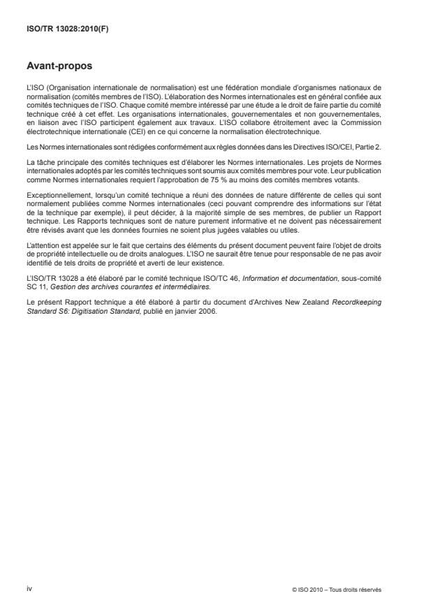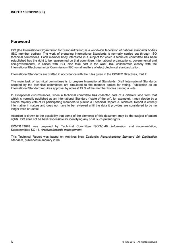 ISO/TR 13028:2010: establishes guidelines for creating and maintaining records in digital format only, where the original paper, or other non-digital source record, has been copied by digitizing; establishes best practice guidelines for digitization to ensure the trustworthiness and reliability of records and enable consideration of disposal of the non-digital source records; establishes best practice guidelines for the trustworthiness of the digitized records which may impact on the legal admissibility and evidential weight of such records; establishes best practice guidelines for the accessibility of digitized records for as long as they are required; specifies strategies to assist in creating digitized records fit for long-term retention; and establishes best practice guidelines for the management of non-digital source records following digitization. ISO/TR 13028:2010 is applicable for use in the design and conduct of responsible digitization by all organizations undertaking digitization, either business process digitization or back capture digitization projects for records management purposes, as outlined in ISO 15489-1:2001 and ISO/TR 15801:2009. ISO/TR 13028:2010 is not applicable to: capture and management of born-digital records; technical specifications for the digital capture of records; procedures for making decisions about records' eventual disposition; technical specifications for the long-term preservation of digital records; or digitization of existing archival holdings for preservation purposes.