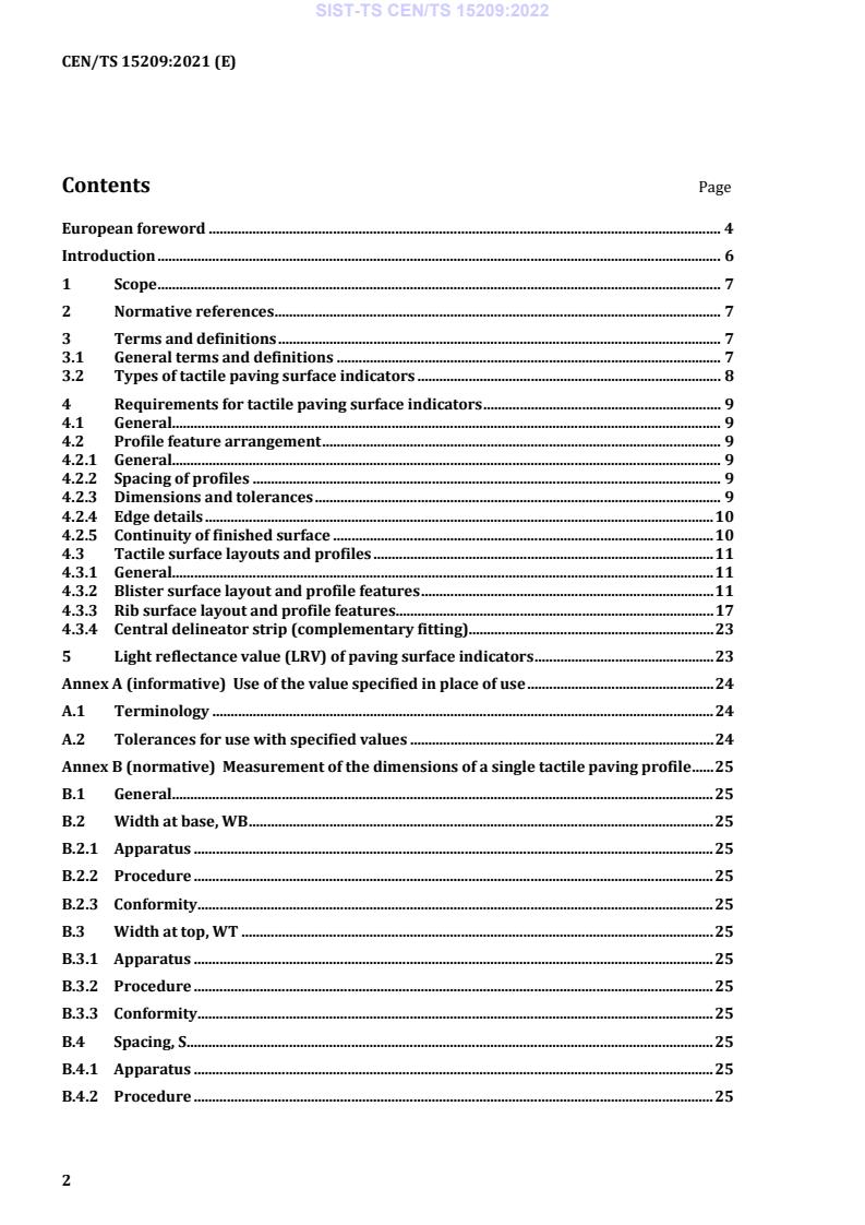 SIST-TS CEN/TS 15209:2022 is a technical specification published by the Slovenian Institute for Standardization (SIST). Its full title is "Tactile paving surface indicators produced from concrete, clay and stone". This standard covers: This document specifies the method of measurement and acceptance criteria for the dimensions for surface profile features and patterns for the surface of pedestrian paving units, used to convey information for visually impaired people. It applies to paving units made of concrete, clay and stone where the tactile profiles are monolithic with the unit. The surface profiles are intended to be applied to units manufactured to EN 1338, EN 1339, EN 1341, and EN 1344 which can be square or rectangular as specified by the designer. It does not specify dimensions of a single tactile paving layout or profile but proposes ranges within which these dimensions should fall. Default dimensions are given in the absence of a national requirement. This document proposes methods of measurement of profiles, light reflectance and colour but does not specify requirements for these characteristics. These properties will be decided by the designer taking into account the regulations, codes of practice, and guidance in the place of use of the units. It does not specify material characteristics.