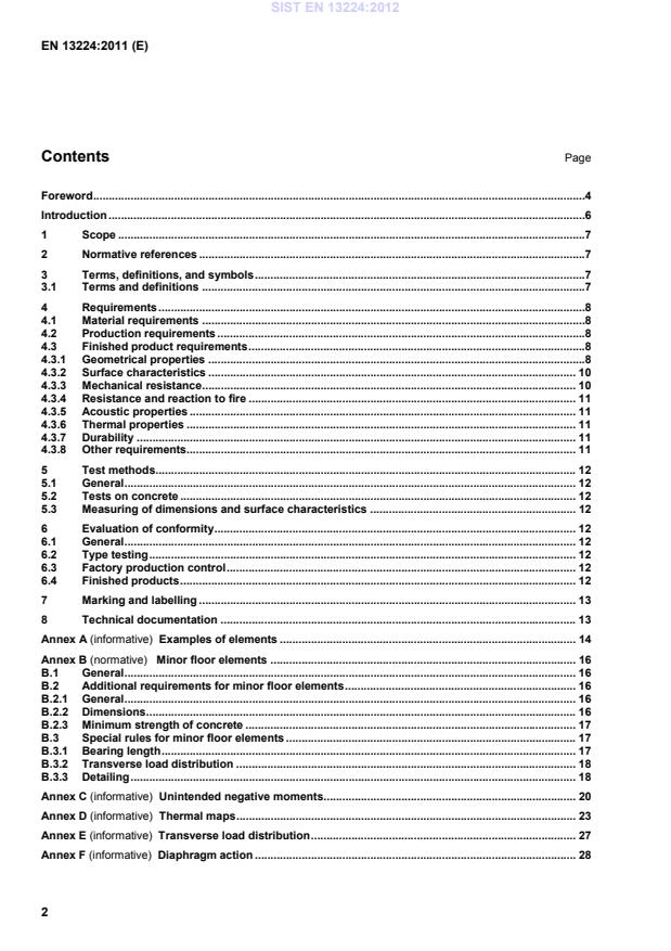 Clauses of this European Standard addressing the provisions of the EU Construction Products Directive . 29ZA.1 Scope and relevant characteristics . 29ZA.2 Procedure for attestation of conformity of precast ribbed floor elements . 31ZA.2.1 System of attestation of conformity . 31ZA.2.2 EC Certificate and Declaration of conformity . 32ZA.3 CE marking and labelling. 33ZA.3.1 General . 33ZA.3.2 Declaration of geometrical data and material properties (method 1) . 35ZA.3.3 Declaration of product properties (method 2) . 37ZA.3.4 Declaration of compliance with a given design specification provided by the client (method 3a) . 39ZA.3.5 Declaration of compliance with a given design specification provided by the manufacturer according to the client's order (method 3b) . 41Bibliography . 43 SIST EN 13224:2012